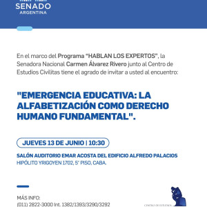 El jueves 13 de junio, en el Salón Auditorio del Edificio Alfredo Palacios del Senado de la Nación, en el marco del Programa “HABLAN LOS EXPERTOS” la especialista montessoriana, Dra. Astrid Stevelynck participó en nombre de FAMM de la convocatoria de la Senadora Nacional Carmen Alvarez Rivero junto el Centro de Estudios Civilitas titulada “EMERGENCIA EDUCATIVA: La Alfabetización como Derecho Humano Fundamental”. En la que los ORADORES fueron: