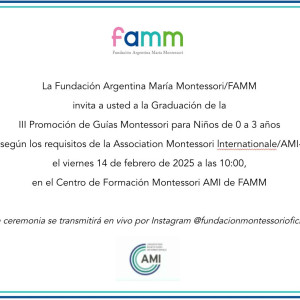 Lideradas por la Entrenadora AMI Mónica Kleiner-Deu, treinta y dos estudiantes provenientes de distintas provincias argentinas, de Suiza, Brasil, Ecuador y Uruguay, con formaciones previas tan variadas como: Educación, Psicología, Literatura, Turismo. Pedagogía, Comunicación, Administración de Empresas, Arte, Música, Idiomas y Medio Ambiente, el viernes 14 de febrero de 2025 celebraron su graduación como III Promoción de Guías Montessori de 0 a 3 años por la Association Montessori Internationale/AMI en el centro de formación Montessori de FAMM.